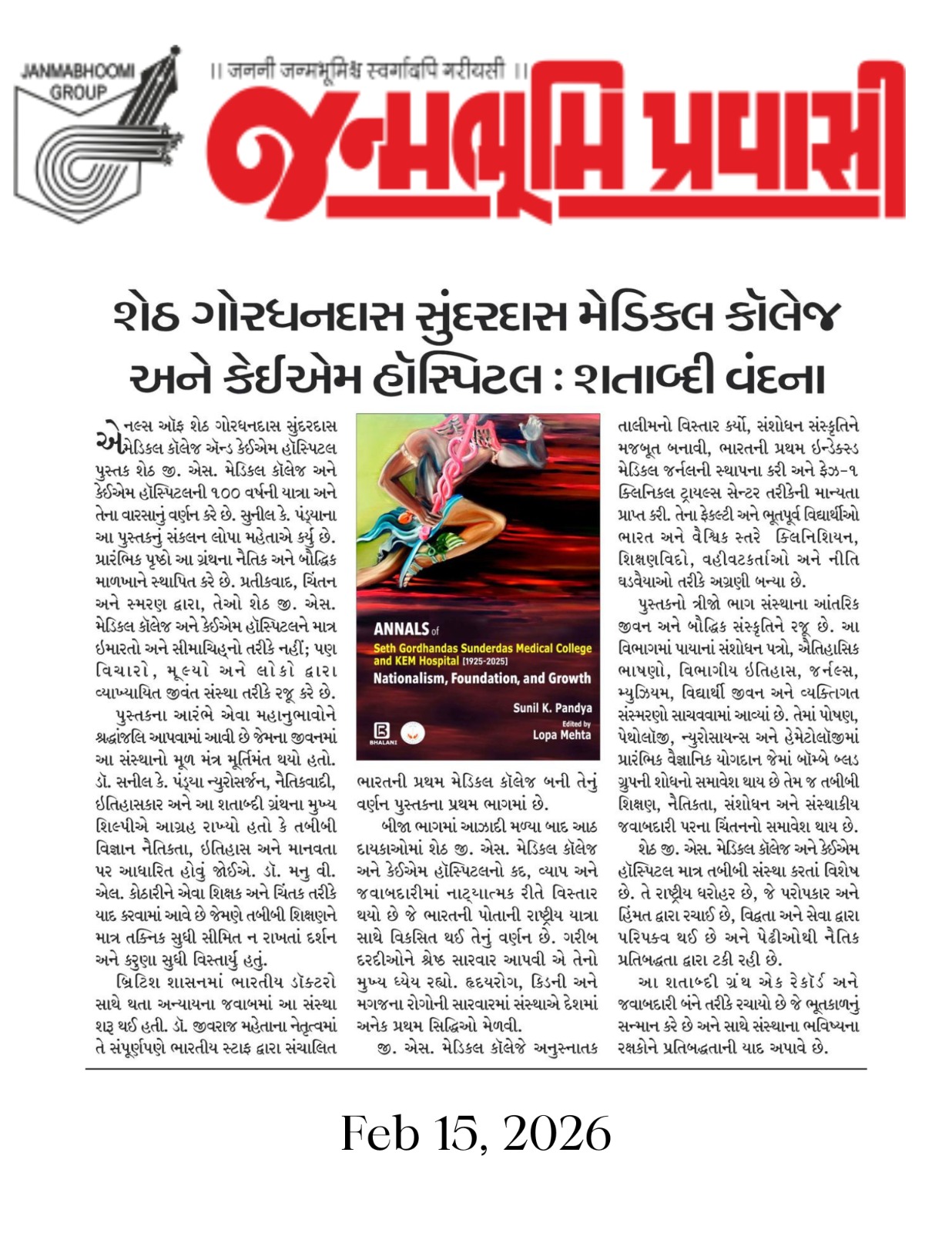 Janmabhoomi Pravasi featured a review of the commemorative volume Annals of Seth Gordhandas Sunderdas Medical College and KEM Hospital (1925–2025): Nationalism, Foundation, and Growth, edited by Sunil K. Pandya and Lopa Mehta. The article traces the hospital’s remarkable 100-year journey — from its founding during the British era under Dr. Jivraj Mehta’s leadership to its growth into one of India’s foremost public medical institutions. The publication chronicles the college’s contribution to nationalism, ethics, medical education, and research, highlighting key milestones including the establishment of India’s first indexed medical journal, a Phase-I clinical trials centre, and pioneering achievements in cardiology, nephrology, and haematology. The centenary volume, described as a record of institutional accountability and pride, pays tribute to all who built and sustained this landmark institution over a hundred years.