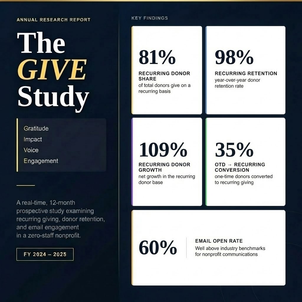 The GIVE Study offers these often-overlooked organizations a replicable roadmap to build recurring support—without the burden of high overhead or complex systems
